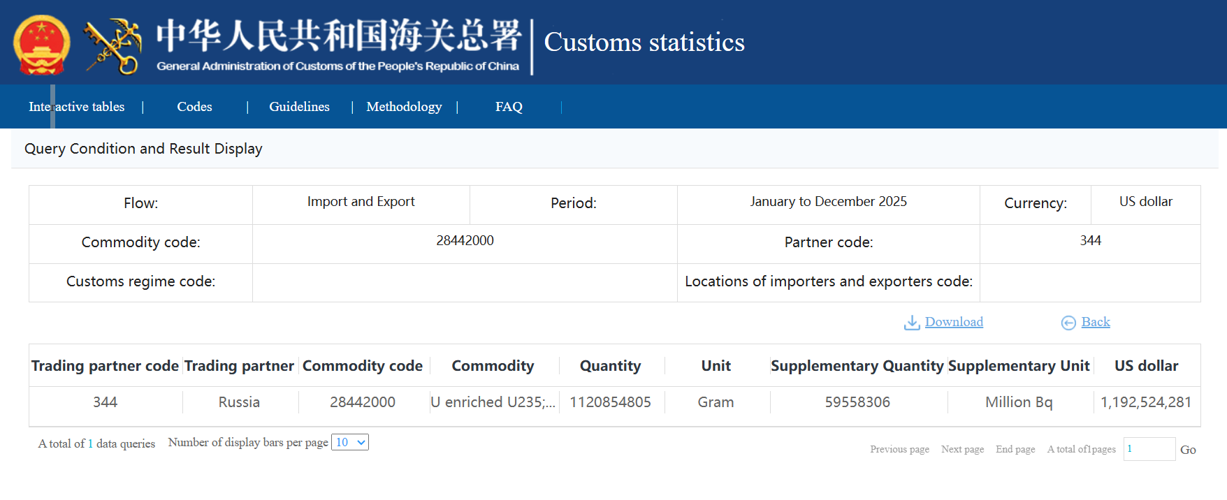 Indeed, Chinese customs data under code 28442000 show that in 2025 shipments from Russia to China amounted to 1,121 metric tons of enriched uranium at an average price of of $1,060 per kg. In 2024, deliveries totaled 748 metric tons at an average price of $1,140 per kg, compared with 467 metric tons at $890 per kg in 2023.